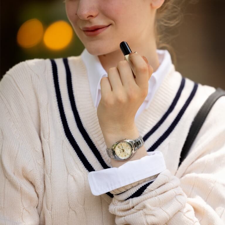 Denne model har både et sporty og ekslusivt udtryk, som bliver kombineret på flotteste vis. Uret, som er fra Seikos ikoniske SNXS-serie, har en changerende guldfarvet skive med flotte gyldne detaljer.