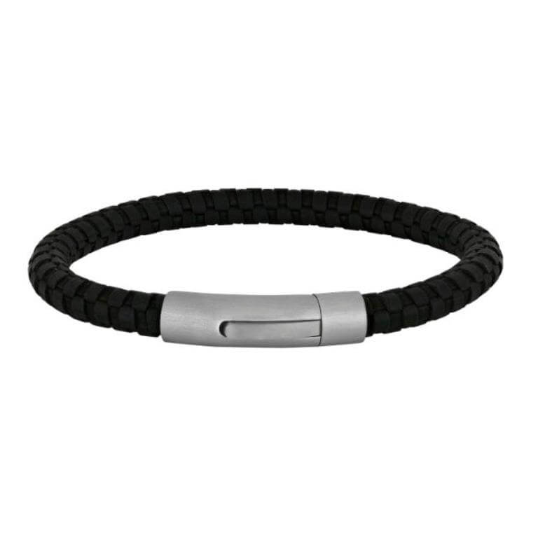 Flot og stilrent armbånd i sort flettet kalveskind med kliklås i stål.