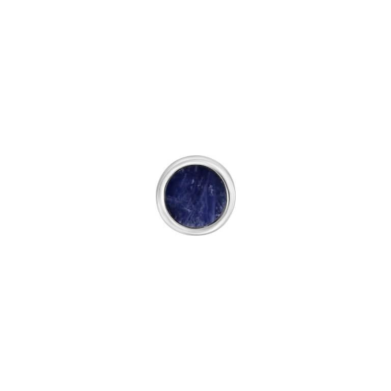 Smart rund ørestik i rhodineret sterlingsølv med en changerende blå sodalit sten.