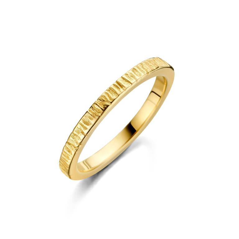 Canis-ringen i 18 karat forgyldt 925 sterlingsølv forener moderne minimalisme med et markant, organisk formsprog. De bløde linjer smyger sig om fingeren og skaber et stilrent udtryk, der både føles råt og raffineret. Et karakterfuldt design, der kan bæres alene eller kombineres med andre ringe for et personligt look.