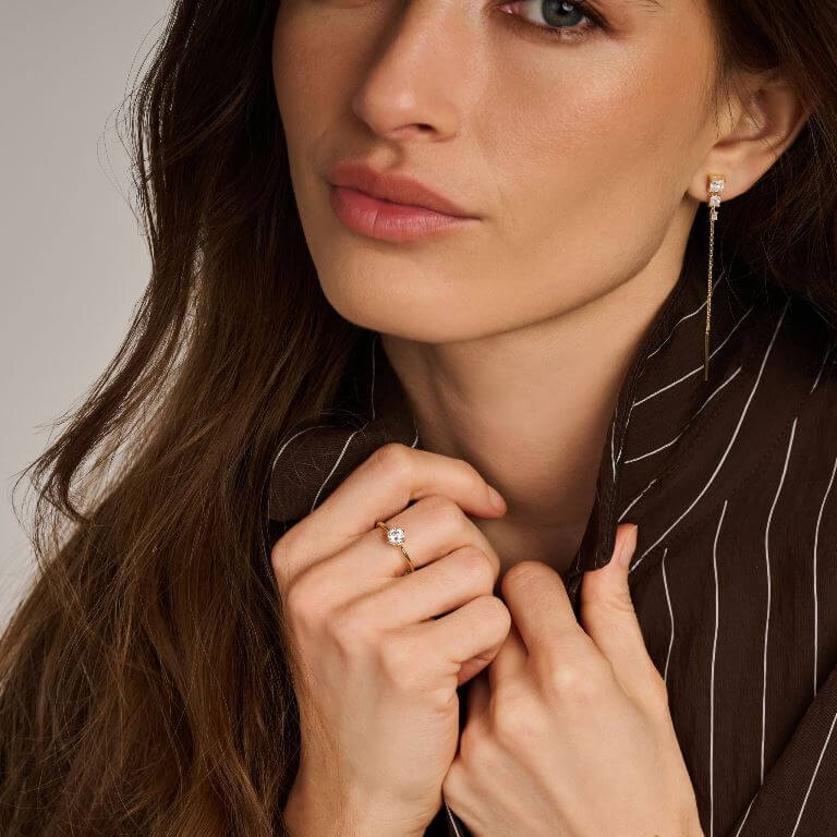 Selina Ring M – Ren elegance med et glimt af luksus. Selina-ringen er en klassisk og strålende ring i genanvendt 18 karat forgyldt 925 sterlingsølv med en stor, klar zirkonia-sten som midtpunkt. Den smukke sten holdes elegant på plads af fine grabber, der lader lyset spille frit og fremhæver dens glans. Et tidløst design, der emmer af eksklusivitet – perfekt til særlige øjeblikke eller som et statement i hverdagen.