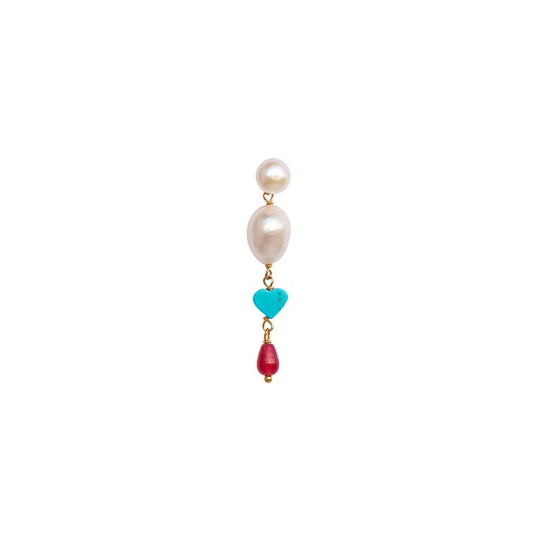 Smuk ørering med runde hvide ferskvandsperler, der danser smukt. De dansende ferskvandsperler giver liv og bevægelse til dit look, når du bærer denne ørering, og suppleres smukt af det turkise hjerte og rubinrøde dråbeformede agat-vedhæng. Bær denne guldørering alene eller mix med andre smukke øreringe fra STINE A Jewelry.