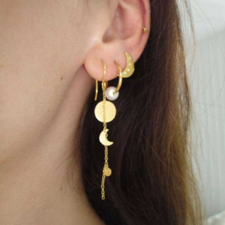 Fortryllende ørering med kæder pyntet med mønter og måne.