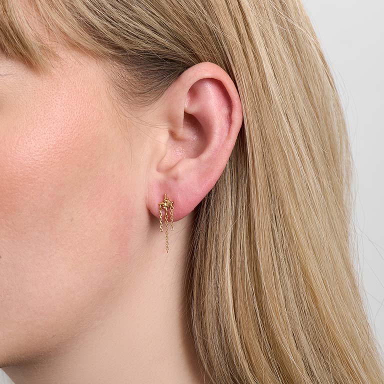 Designet er inspireret af isens rå tekstur. De små ørestikker har en organisk overflade med polerede detaljer, der fanger lyset og giver et enkelt, men markant udtryk. Tre fine kædestykker hænger fra hver ørering og tilfører bevægelse, som gør designet mere levende.