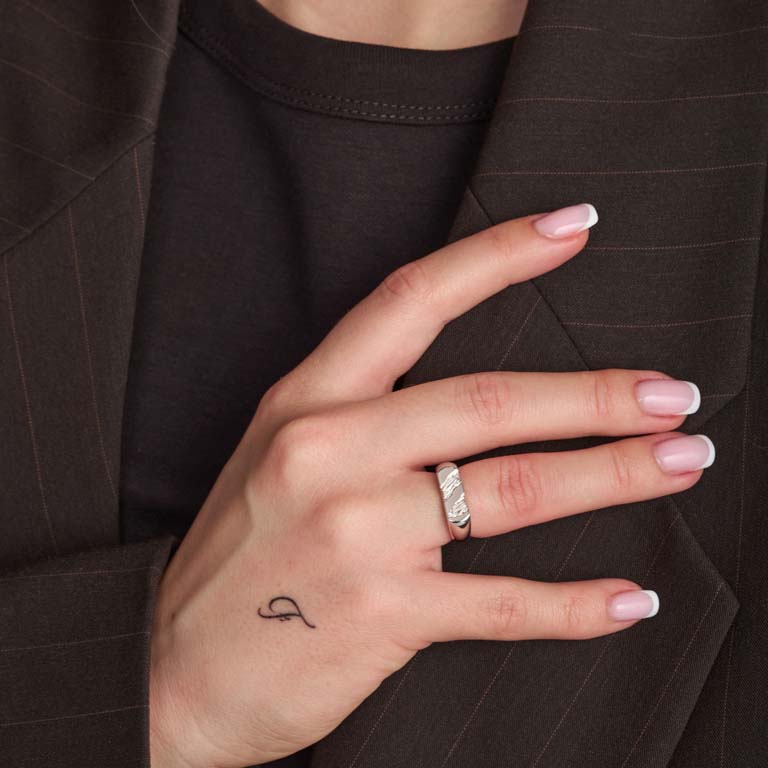 Designet er inspireret af gletschere og kombinerer en rå, is-lignende struktur med en poleret overflade. Kontrasten mellem de to giver ringen et markant design og en glans, der fanger lyset diskret.