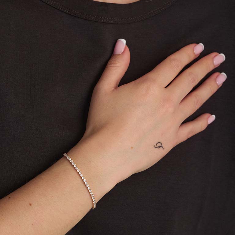 Armbåndet er sammensat i et væld af zirkonia sten der med sine mange usynlige led gør armbåndet særligt blødt og fleksibelt. Kvaliteten er sikret med et materiale af 925 rent sterling sølv, forgyldt i 18 kt. guld.