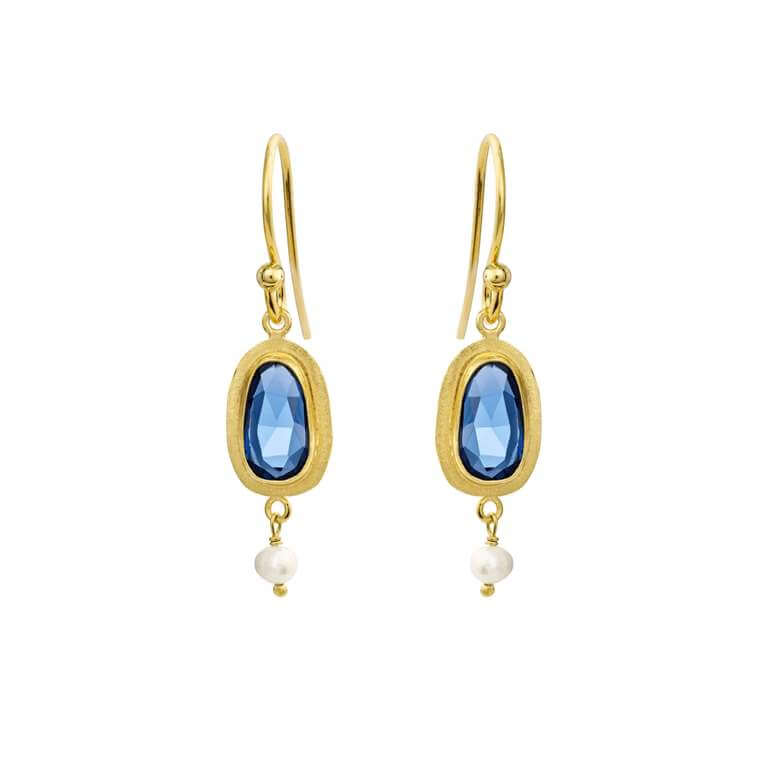 Skønne øreringe på bøjle med en facetteret London Blue topas som glimtende og farverig centrum. Fra denne hænger der en dansende hvid ferskvandsperle.