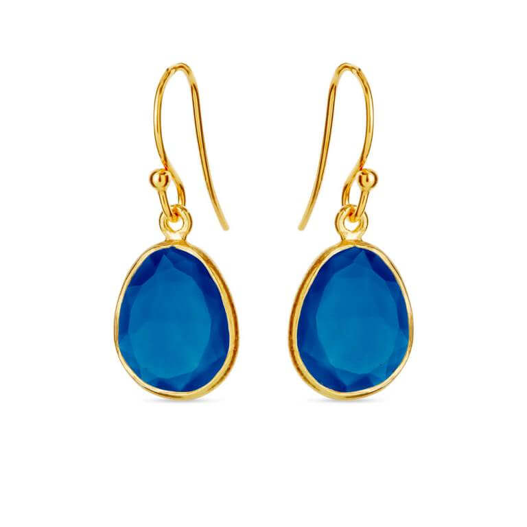 Skønne øreringe i forgyldt sølv med vedhæng af facetteret mørkeblå krystal (11x13 mm).