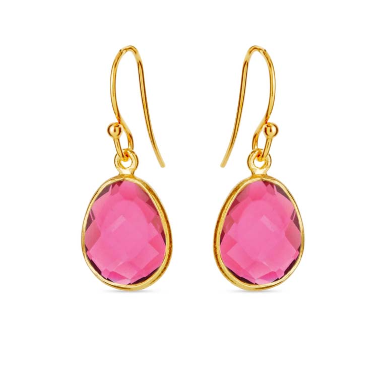 Skønne øreringe i forgyldt sølv med vedhæng af facetteret pink krystal (11x13 mm).