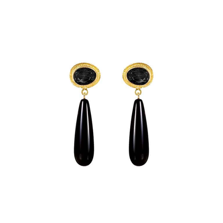 Eksklusive øreringe hvis lange dråbeformede sorte agat sten, gør dem til en afdæmpet og eksklusiv statement ørering udover det sædvanlige. Øverst sidder der facetteret oval sort agat som prikken over i'et.