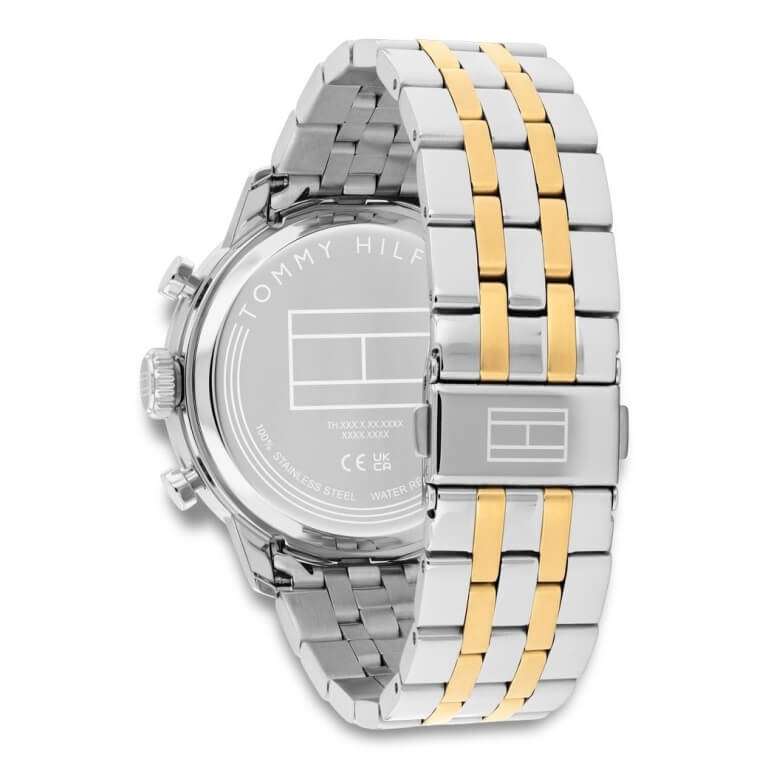 Stilrent og flot ur fra Tommy Hilfiger. Modellen har en behagelig lænke i rustfrit stål i et flot miks af stål og gulddoublé og en eksklusiv grøn skive. Uret er også udstyret med kronograf der tilføjer stopurs-funktion som kontrolleres med knapperne på højre side.