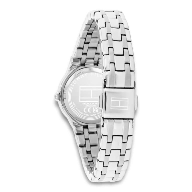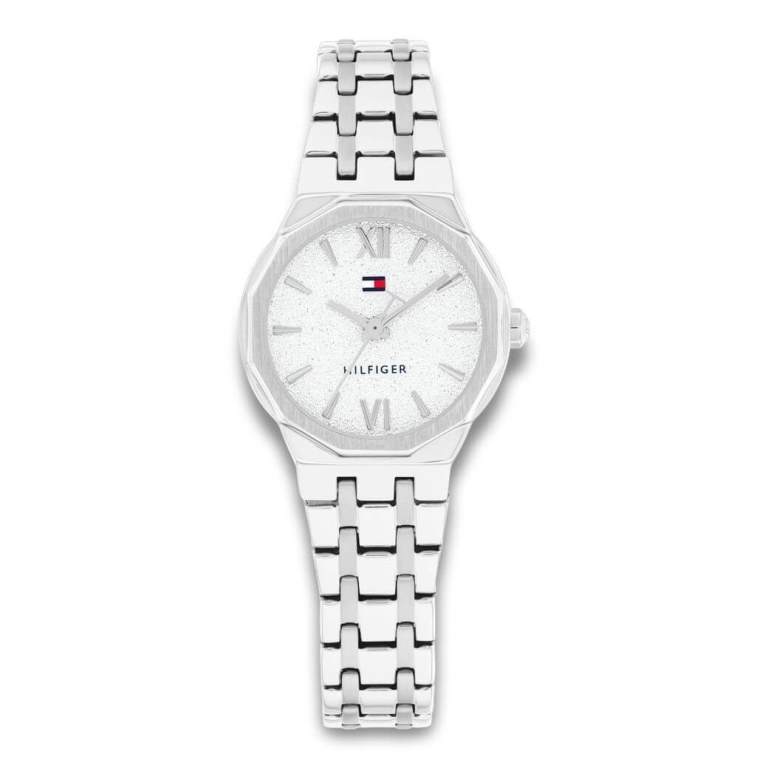 Fint og petit dameur udført i rustfrit stål. Skiven glitrer og er prydet med både Tommy Hilfiger navn og logo.