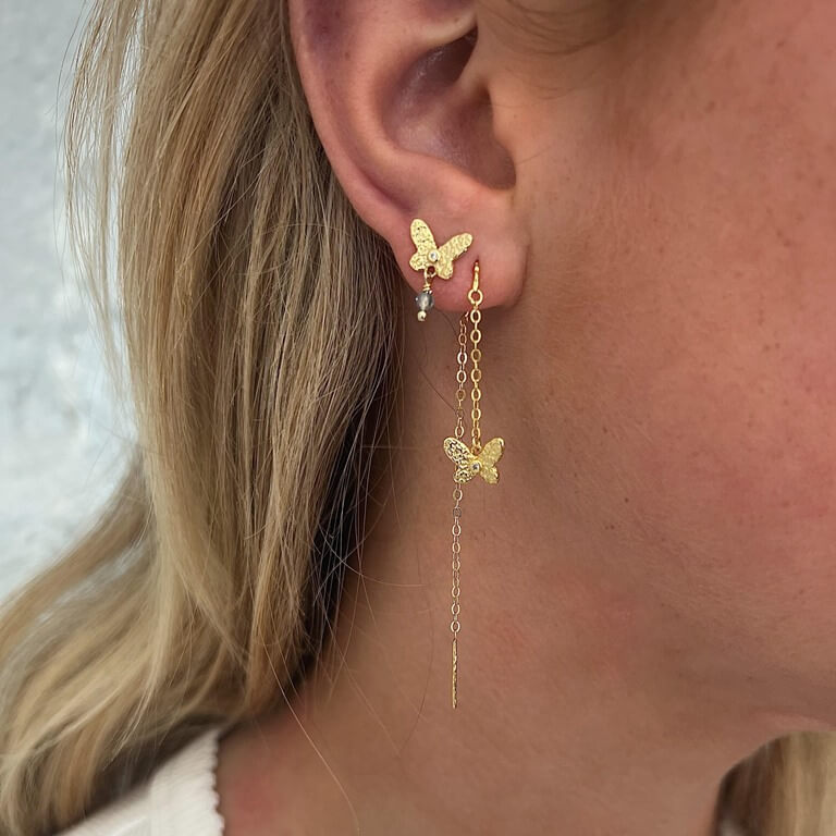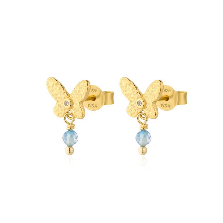 Tilføj et strejf af elegance og lethed til din forår- og sommergarderobe med Norma øreringene. Designet i 14 karat guldbelagt 925 sterlingsølv, prydes de af fine sommerfugle, der symboliserer frihed og skønhed. Den funklende zirkonia, placeret i sommerfuglens midte, giver øreringene et ekstra touch af glans, mens de smukke blå zirkonia-sten tilføjer et delikat farvespil.