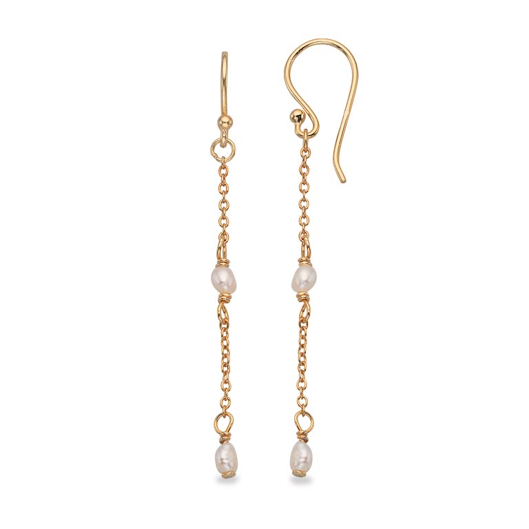 Disse elegante ørebøjler fra Scrouples er fremstillet i forgyldt sterlingsølv og prydet med smukke barok ferskvandsperler. De delikate kæder, der afsluttes med perler, skaber en yndefuld bevægelse, som tilføjer et feminint og sofistikeret udtryk.