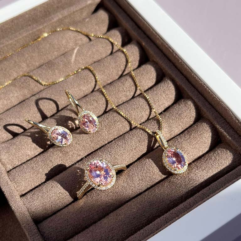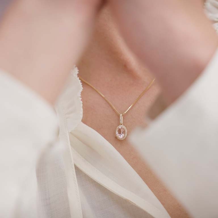 Morganittens lyserøde nuance gør dette smykke til det perfekte valg til en romantisk gave eller til at fuldende et sofistikeret look. Rosetten fremhæver stenens naturlige glød, mens de klare diamanter tilføjer et strålende spil af lys. Perfekt til både hverdag og fest.