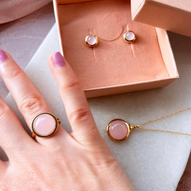 Denne elegante ring fra Scrouples er udført i 8 kt. guld og prydet med en smuk calcedon sten. Den blide rosa farve fra calcedonen kombineret med den varme gyldne glans fra guldet skaber en sofistikeret og tidløs ring, der er ideel til både hverdag og festlige lejligheder.