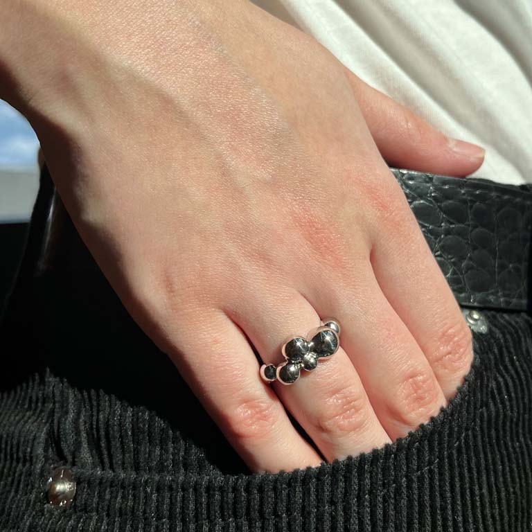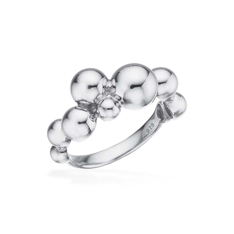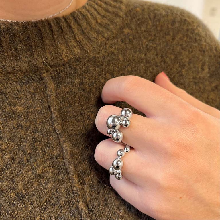 Ringen er udsmykket med flere polerede sølvkugler, der er smukt arrangeret i en dynamisk formation. Denne legende tilgang til design giver ringen en levende tekstur, der fanger lyset fra alle vinkler og tilføjer et ekstra strejf af glans. Den glatte sølvoverflade og de forskellige kuglestørrelser skaber et unikt visuelt udtryk, der skiller sig ud.