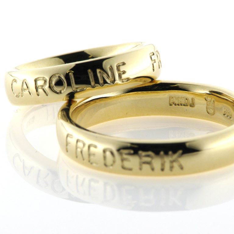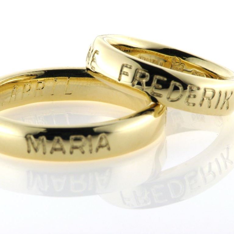 1 par ringe, med 3 navne fræset ned i hver skinne (udvendig gravering)
