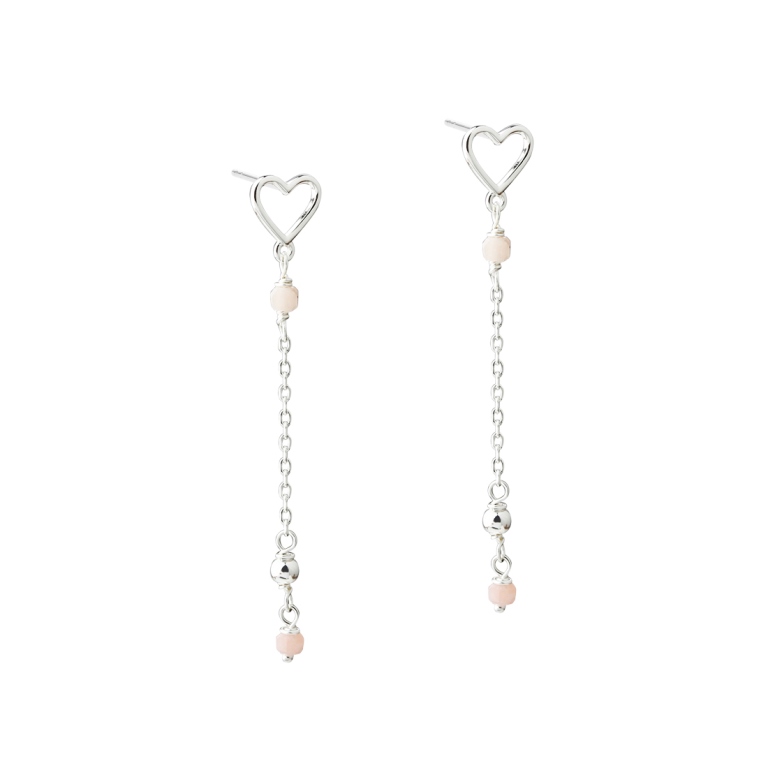 Elegante og fine ørehængere i sterlingsølv med hjerte og lyserøde stenperler i forskellige nuancer.