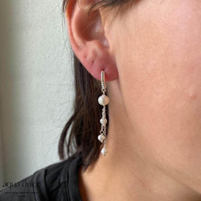 12 mm. creoler i sterlingsølv med snoninger & vedhæng med flotte ferskvandsperler.