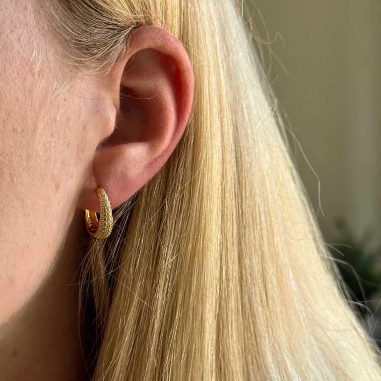 Smukke knækcreoler med vidde og en samling af skønne funklende zirkonia-sten. Øreringene er perfekte til hverdagsbrug, men egner sig særligt til en festlig lejlighed hvor der skal tilføjes lidt ekstra glitter og glamour til outfittet.