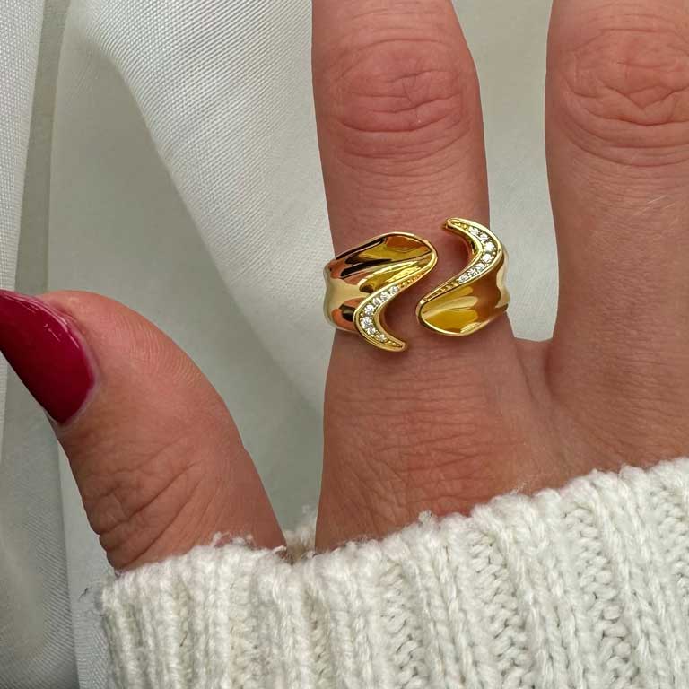 Smuk fingerring med to elegante bølger på toppen. Begge bølger er prydet med funklende klare zirkonia-sten. Ringen er åben og kan justeres en smule i størrelsen.