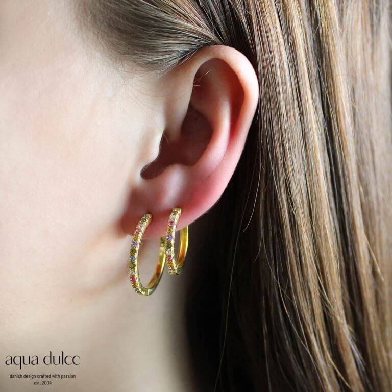 Smukke 20 mm. creoler i forgyldt sterlingsølv med pastelfarvede zirkonia-sten.