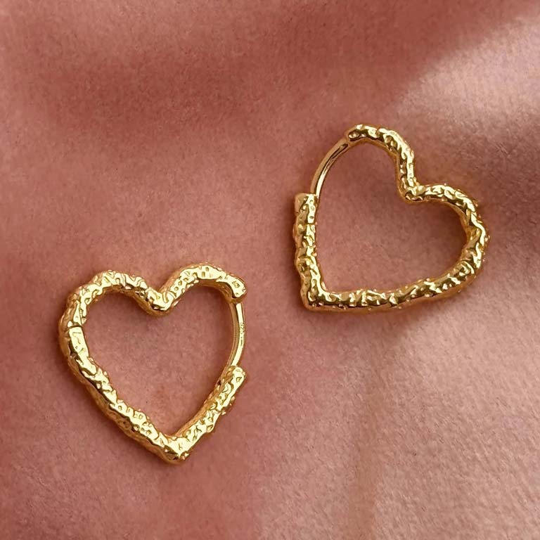 Smukke knækcreoler der er formet som et skævt hjerte med en rå overflade.