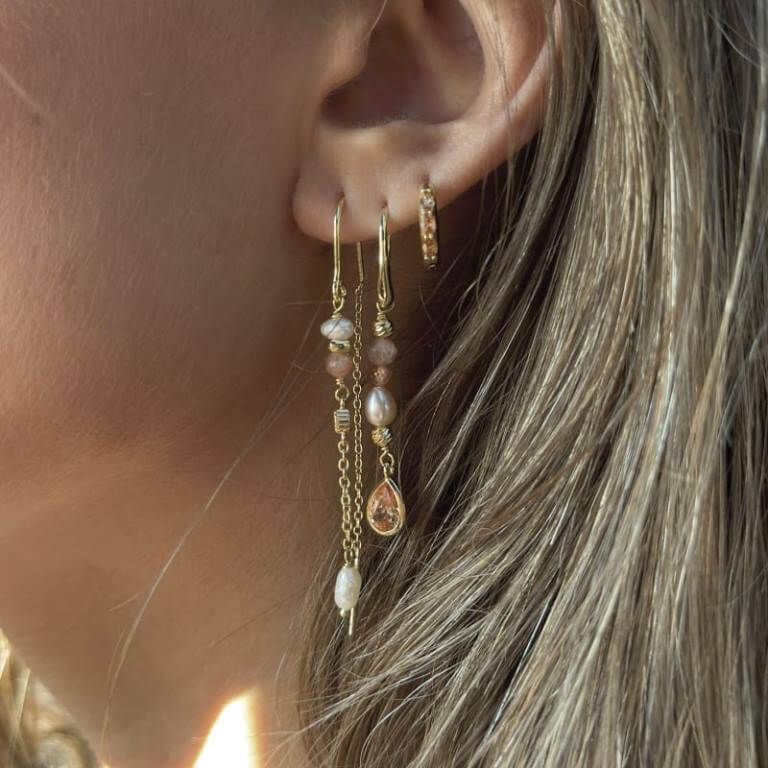 Trænger du til en farverigt men samtidig diskret tilføjelse til dit outfit? Så er Sunella Simple Earthread øreringene det helt rigtige valg. Fra den elegante bøjle hænger der en smuk række af hvide ferskvandsperler, fattede klare zirkonia-sten samt farverige facetterede rosa sunstones. I fin samhørighed danser disse frit fra bøjlen og giver masser af liv og farve.