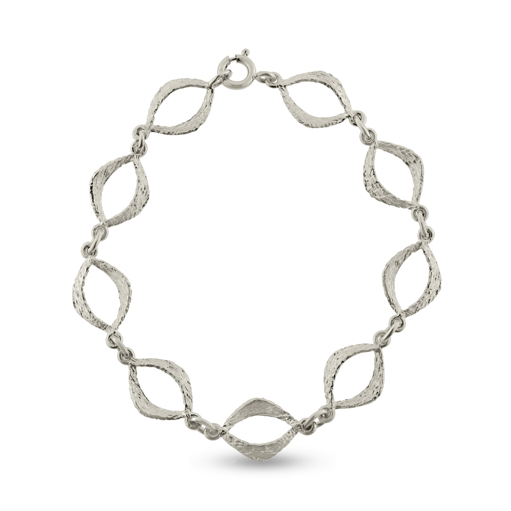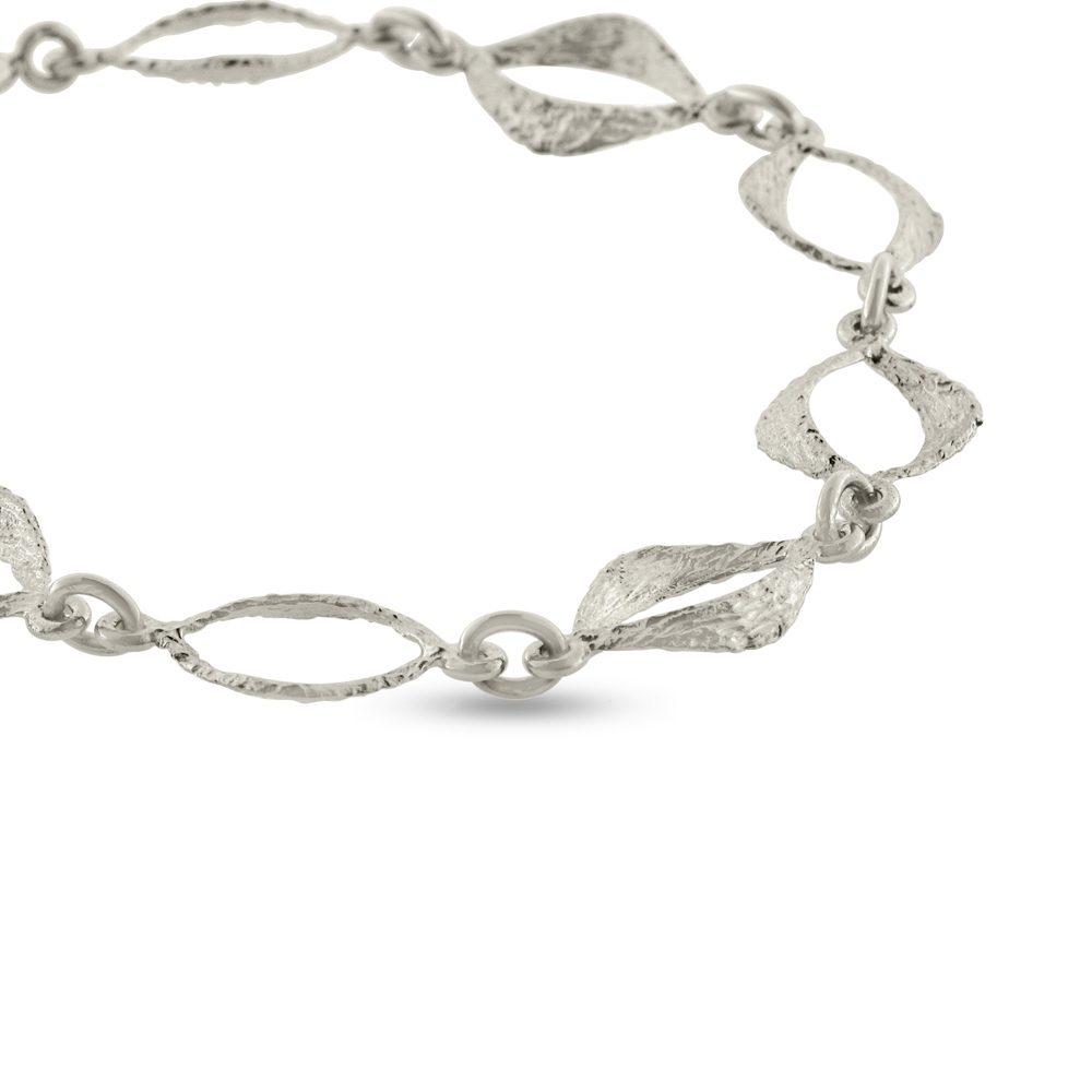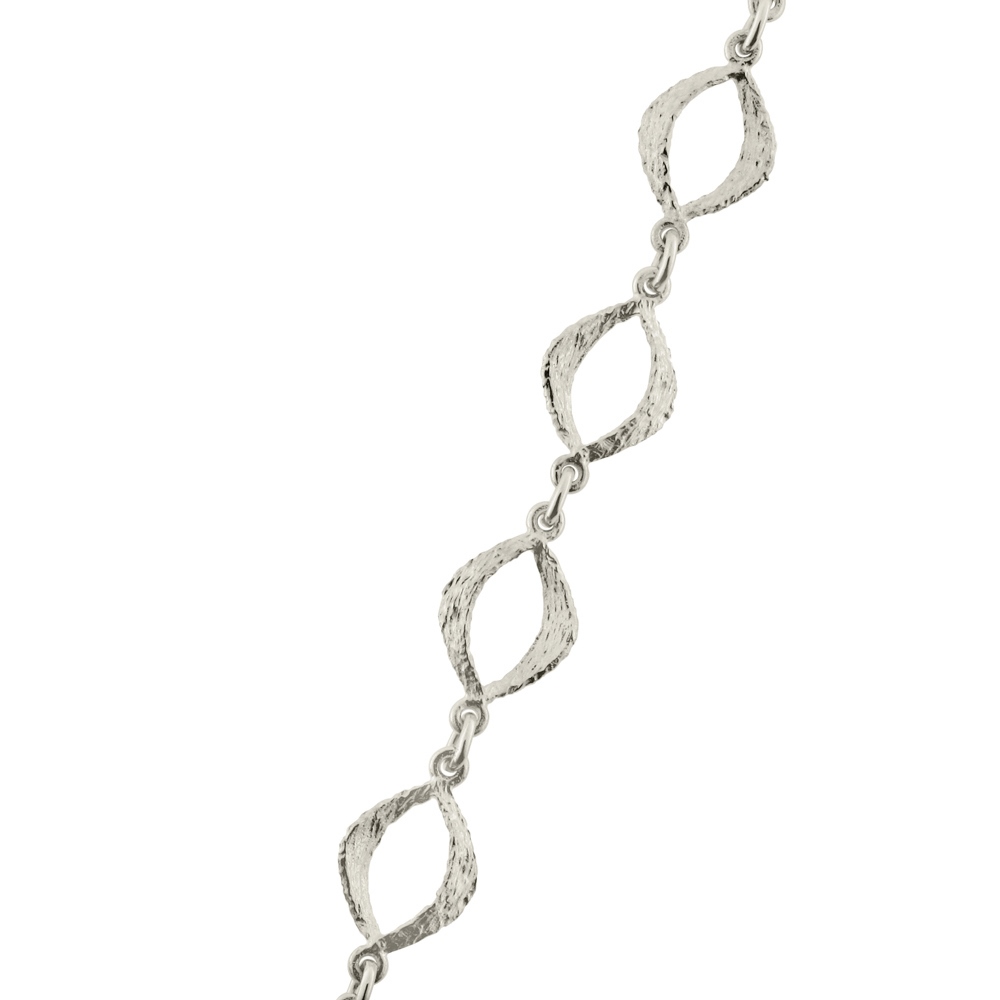 Elegant armlænke i massiv 14 karat hvidguld sølv dannet af smukke og bevægende led. Ledene har en barket overflade der tilføjer noget råt men også elegant til armlænkens endelige udtryk. Armlænken placerer sig behageligt på håndleddet og det kan nemt matches med ethvert outfit. Armlænken holdes sammen af en kraftig fjederlås i god kvalitet.