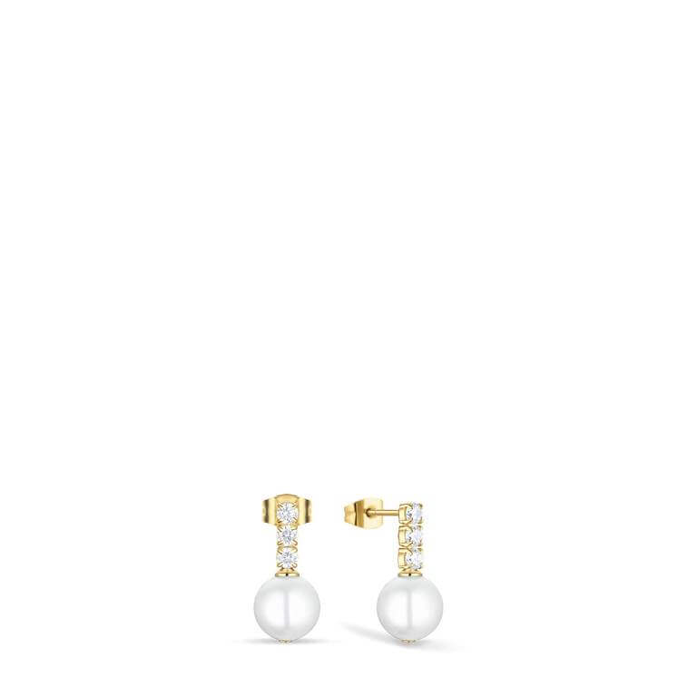 Gylden enkelhed med tidløs ynde: Disse BERING øreringe forener klassisk design med det bløde skær fra en hvid perle – nyfortolket i varmt guldfarvet stål. Tre funklende zirkonia leder blikket mod en perfekt rund perle, der svæver elegant.