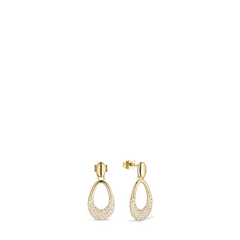 Øreringene forener klassisk elegance med et moderne, gyldent udtryk. Det smukke dråbedesign er udsmykket med glitrende pavé-krystaller, der fanger lyset og giver et eksklusivt, sofistikeret look.