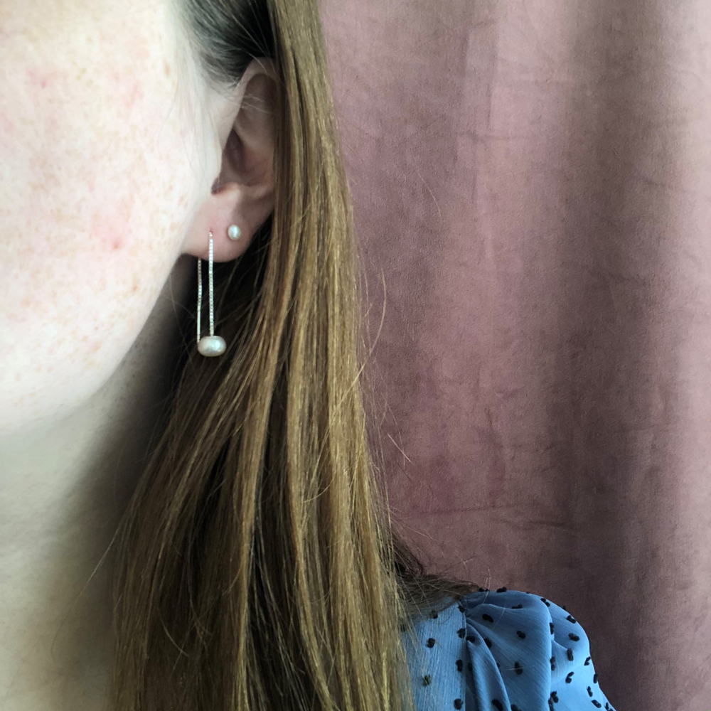Smuk ørehænger i sølv med en stav i den ene ende og en skøn ferskvandsperle i den anden.