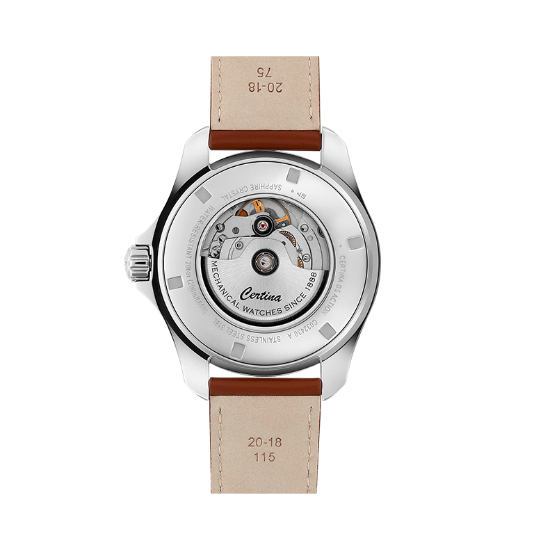 Certina herreur med brun læderrem og blå urskive. Automatisk urværk med hele 80 timers ganreserve med ridsefrit safirglas. Uret har flot skruekrone der holder vandet ude. Vandtæthed helt ned til 200 meter som er godkendt til flaskedykning.