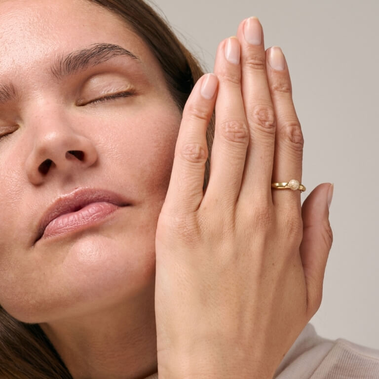 Ariel-ringen er en ægte Enamel Copenhagen-ring. Guldperlen med den glitrende emalje-overflade smelter smukt sammen med den håndlavede overflade, som på denne ring har et smeltet, bølget look. Perlen er en sjov anderledes detalje på ringen, som i denne sammenhæng fremstår eksklusiv.