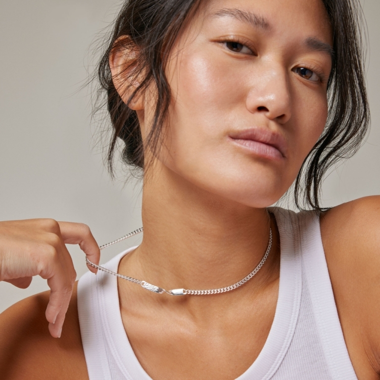 Nadia halskæden, er en ENAMEL Copenhagen halskæde med mere volumen end sædvanlig. Panserkædens stilrene look går super godt i spænd med de rå detaljer på det tvistede vedhæng. Vedhænget buer en smule, så det lægger sig pænt, på kravebenet. Nadia er uden tvivl noget for dig, hvis du godt kan lide et chunky men feminint smykke med maskuline detaljer. Nadia findes også som armbånd, samt i en sølvudgave.
