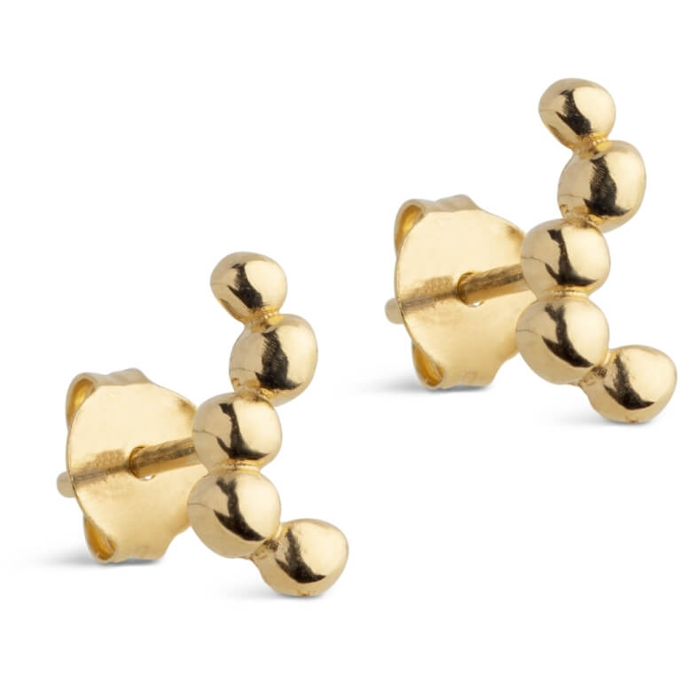 Nara Long har et organisk og skulpturelt look, hvor de bløde bobler ligger side om side i en bølgende rytme. Overfladen er blankpoleret i en varm guldfarve, og de afrundede elementer minder om små, glatte sten formet af naturens kræfter. Designet udstråler balance og harmoni, samtidig med at det har en rå og moderne kant. Nara Long øreringen findes også i sølv.