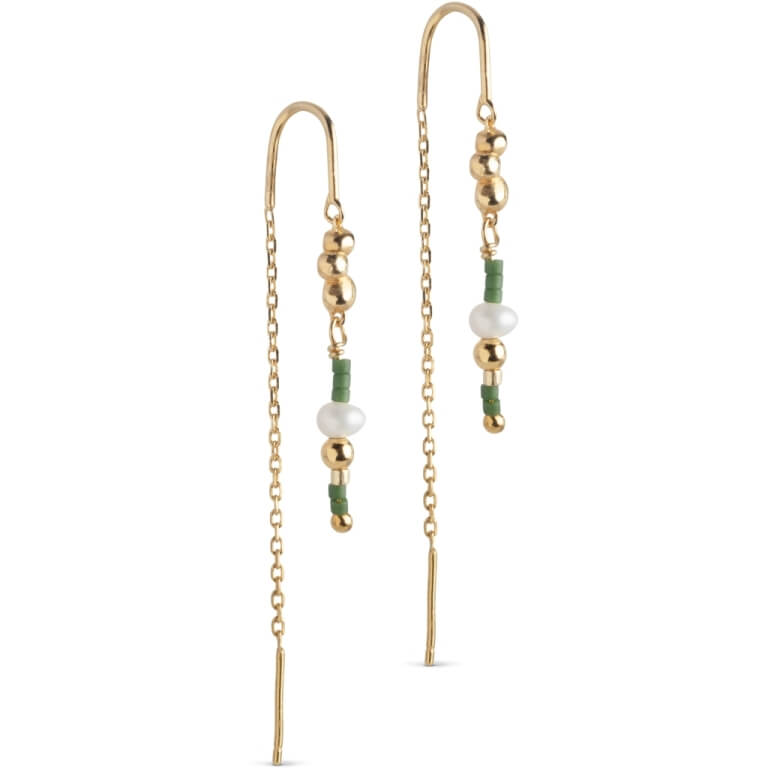 Nara Miyuki-øreringen har et moderne og legende udtryk med sin unikke blanding af materialer og former. Den øverste del er udsmykket med organiske guldelementer, hvilket giver smykkerne en blød og skulpturel karakter. Den hvide ferskvandsperle tilføjer et klassisk og feminint touch, mens miyuki-perlerne skaber et friskt farvespil og står i livlig kontrast til guldet. Den delikate kæde tilføjer bevægelse og lethed, hvilket gør, at øreringen falder smukt og dynamisk, når den bæres. En feminin ørering, der kombinerer naturlig elegance med moderne kant.