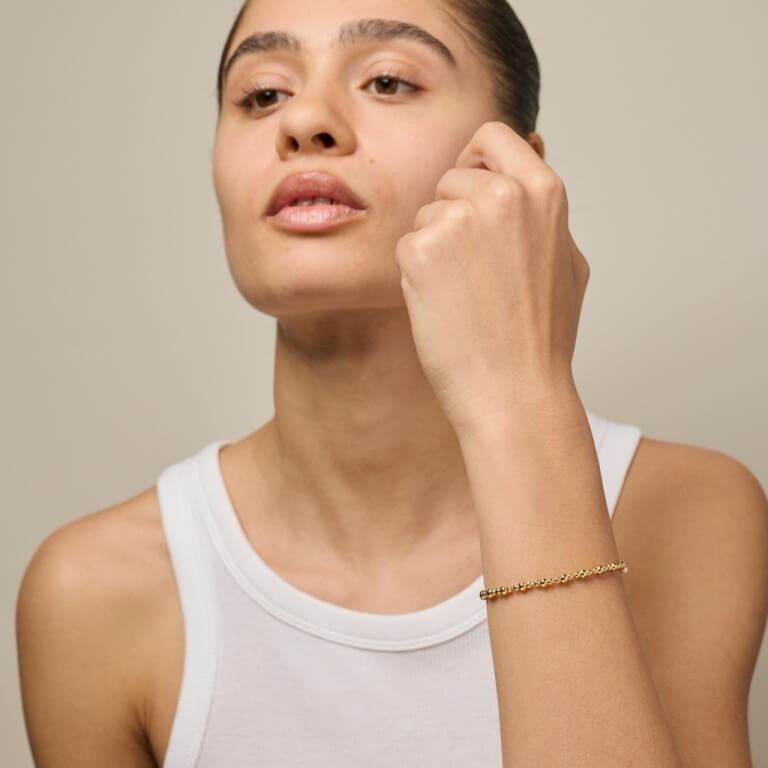 Norma Bead er et elegant armbånd bestående af små, polerede guldperler i forskellige størrelser. De subtile variationer skaber et organisk flow og giver smykket et feminint og raffineret udtryk. En lille beige emaljeperle ved låsen tilføjer et diskret og charmerende twist. Perfekt alene - eller i en blanding med andre armbånd for et personligt look.