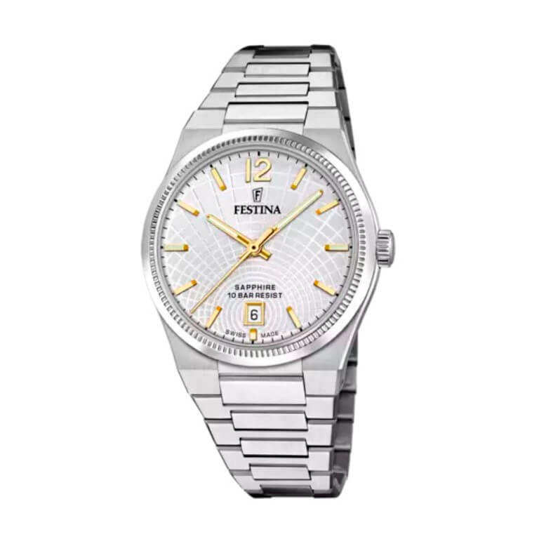 Elegant og sporty dameur fra Festina med en flot mønstret skive og en behagelig lænke i rustfrit stål med foldespænde. Urkassen er samtidig tynd og den passer flot i forlængelse med den iøjefaldende lænke. Uret har schweizisk urværk, ridsefast safirglas og datovisning. Derduover er det vandtæt ned til 100 meter. Bemærk samtidig de guldfarvede indeks som tilføjer en smuk ekstra detalje til uret.