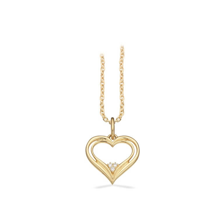 Sødt hjertevedhæng i 8 karat guld med tre fattede brillanter nederst (i alt 0,015 ct. H-W/SI).