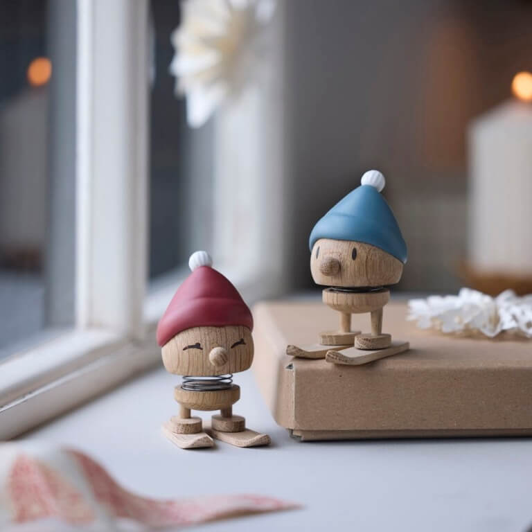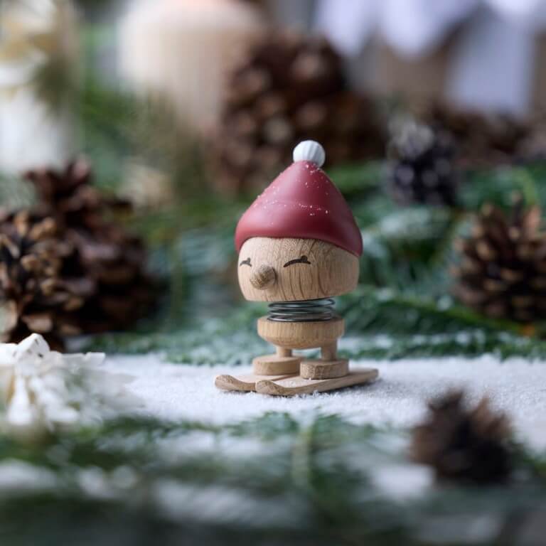 Giv den rødkindede skihoptimist et lille puf og se den hoppe af glæde over den glitrende hvide sne på fjeldet. Skiing Bimble står klar med sin røde tophue – både spændt og stolt – klar til eventyr i vinterlandskabet. Skiene kan tages af og på. Varen er produceret i FSC®-certificeret egetræ (FSC-C166612).