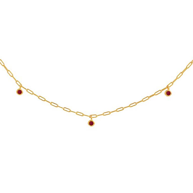 Amber er en smuk halskæde prydet med skønne vedhæng med funklende røde zirkoniasten. Vedhængende er nænsomt fordelt langs kæden for maksimal effekt.