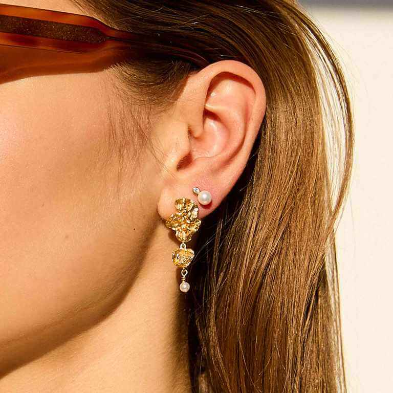 Disse skønne statement-øreringe i forgyldt sølv har en elegant rå overflade samt smukke hvide ferskvandsperler og pladeled som danser frit fra ørestikken. Bær dem alene eller kombinér dem med andre skønne øreringe for at fuldende dit look.