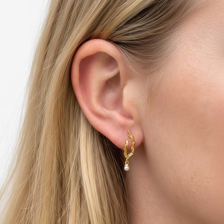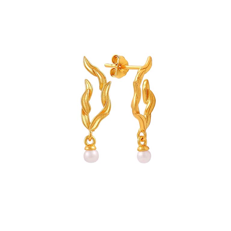 Disse smukke øreringe er håndlavet i 18 karat forgyldt sterling sølv, og deres naturtro og organiske form udstråler elegance og ynde på fineste vis. Nederst finder du et par magiske hvide ferskvandsperler.