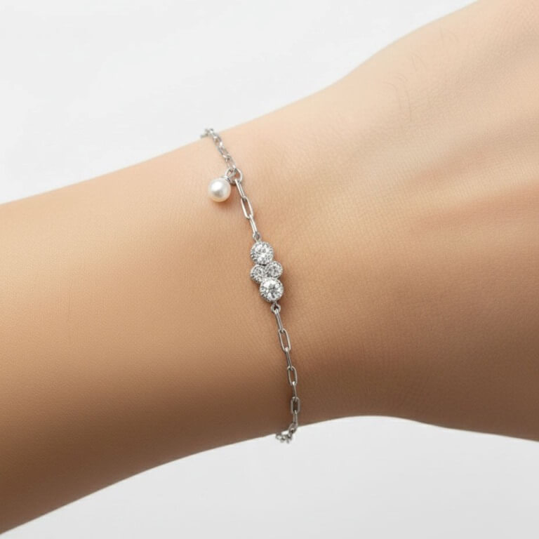 Scarlet er et skønt og enkelt kædearmbånd udført i 925 sterlingsølv. Midt på armbåndet sidder der en klynge af funkle klare zirkoniasten i forskellige størrelser. Som en lille fin ekstra detalje er der monteret en elegant hvid ferskvandsperle ved siden af.
