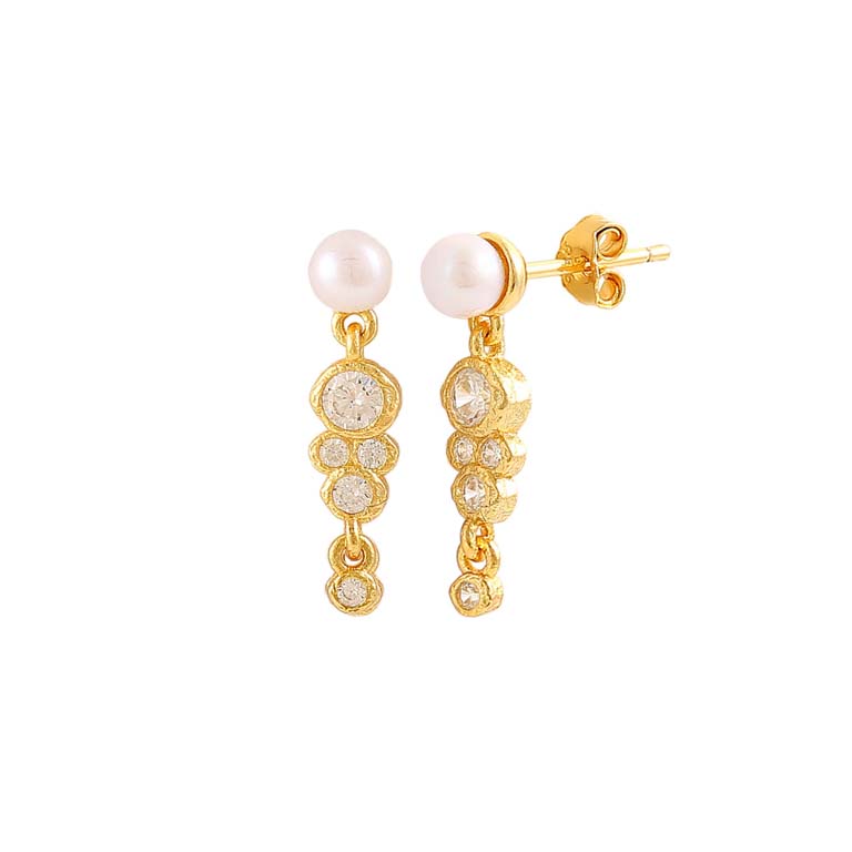 Scarlet er et par elegante øreringe prydet med en magisk hvid ferskvandsperle hvorfra der hænger et par vedhæng fyldt med funklende klare zirkoniasten i forskellige størrelser. Kombinér dem med andre skønne øreringe fra Hultquist for maksimal effekt.