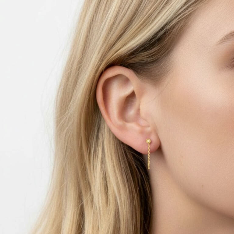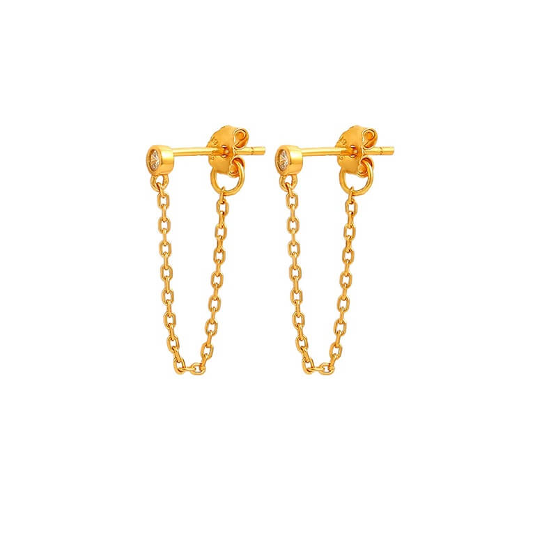 Søde små ørestikker med en skøn behind-ear effekt. Forrest på stikken sidder der en funklende klar zirkonia-sten. Fra denne forløber der sig et kædestykke om til møtrikken. Kombinér dem med andre skønne øreringe fra Hultquist for maksimal effekt.