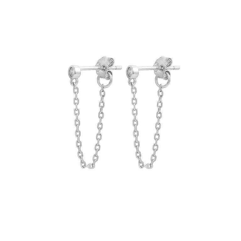 Søde små ørestikker med en skøn behind-ear effekt. Forrest på stikken sidder der en funklende klar zirkonia-sten. Fra denne forløber der sig et kædestykke om til møtrikken. Kombinér dem med andre skønne øreringe fra Hultquist for maksimal effekt.