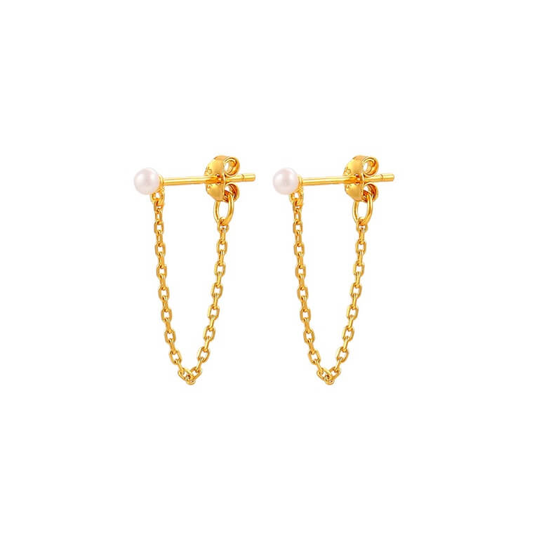 Søde små ørestikker med en skøn behind-ear effekt. Forrest på stikken sidder der en smuk hvid ferskvandsperle. Fra denne forløber der sig et kædestykke om til møtrikken. Kombinér dem med andre skønne øreringe fra Hultquist for maksimal effekt.